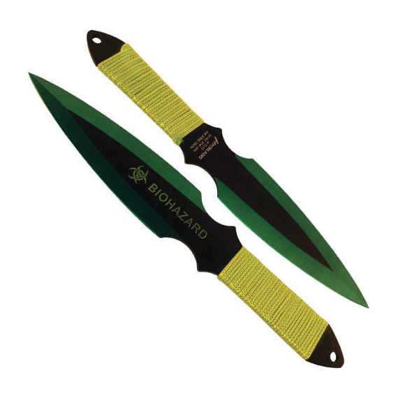 The BioHazard Throwing Knives offer exceptional balance and stability, making them perfect for target practice or honing your throwing technique. Their durable construction withstands repeated use, while the unique biohazard design appeals to collectors and enthusiasts. The cord-wrapped handles ensure a firm hold, reducing the risk of slippage during throws.