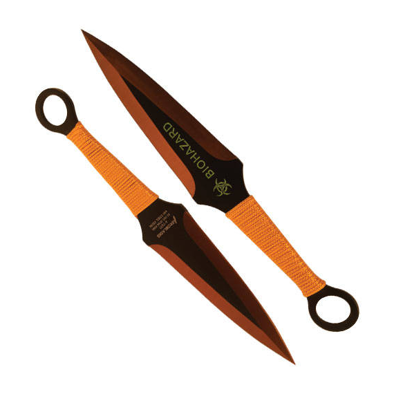The BioHazard Throwing Knives offer exceptional balance and stability, making them perfect for target practice or honing your throwing technique. Their durable construction withstands repeated use, while the unique biohazard design appeals to collectors and enthusiasts. The cord-wrapped handles ensure a firm hold, reducing the risk of slippage during throws.