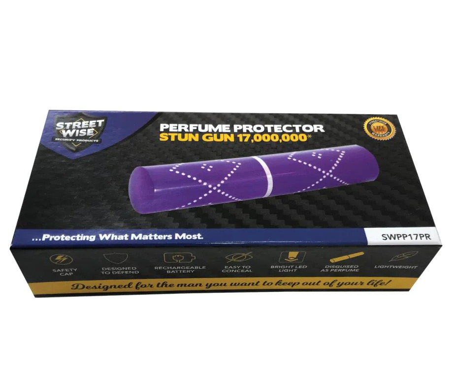 The Streetwise Perfume Protector Stun Gun is a discreet self-defense tool for women, designed to resemble a small bottle of spray perfume while delivering a powerful 17 million volt punch. Perfect for carrying in your purse, this perfume protector stun gun offers the element of surprise in a threatening situation, ensuring you’re always prepared to defend yourself. Available in stylish pink, black, or purple colors, this compact device features a bright LED flashlight, a safety cap to prevent accidental discharge, and a rechargeable battery, making it an essential addition to your personal safety kit.