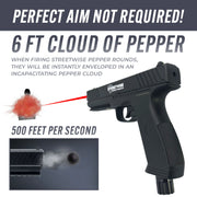 Stay safe with the Streetwise pepperball gun from TBOTECH—the HEAT .50 Caliber Pepper Launcher, a powerful non-lethal self-defense tool for civilians and law enforcement. This semi-automatic pepperball gun fires .50 caliber pepper rounds, metal balls (Quicksilver), or rubber balls at nearly 500 feet per second, with an effective range of up to 60 feet. Pepper rounds release a 6-foot cloud of 5% PAVA (Pelargonic Acid Vanillylamide), causing temporary blindness, coughing, and discomfort for up to 15 minutes—no permanent harm—allowing you to escape danger from a safe distance.
